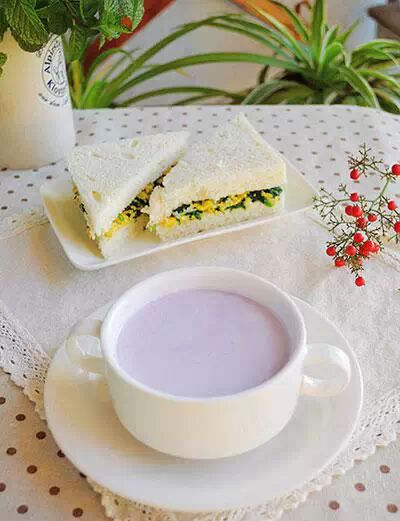 12、酥粒辫子面包+紫甘蓝拌菠菜+核桃芝麻牛奶麦片