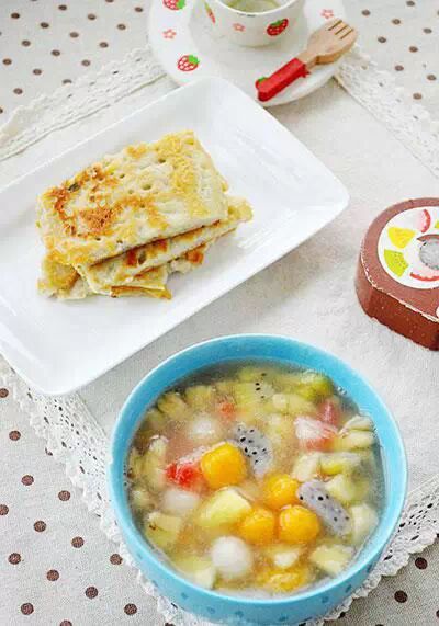 19、青瓜蛋饼+小米红枣红薯粥+提子